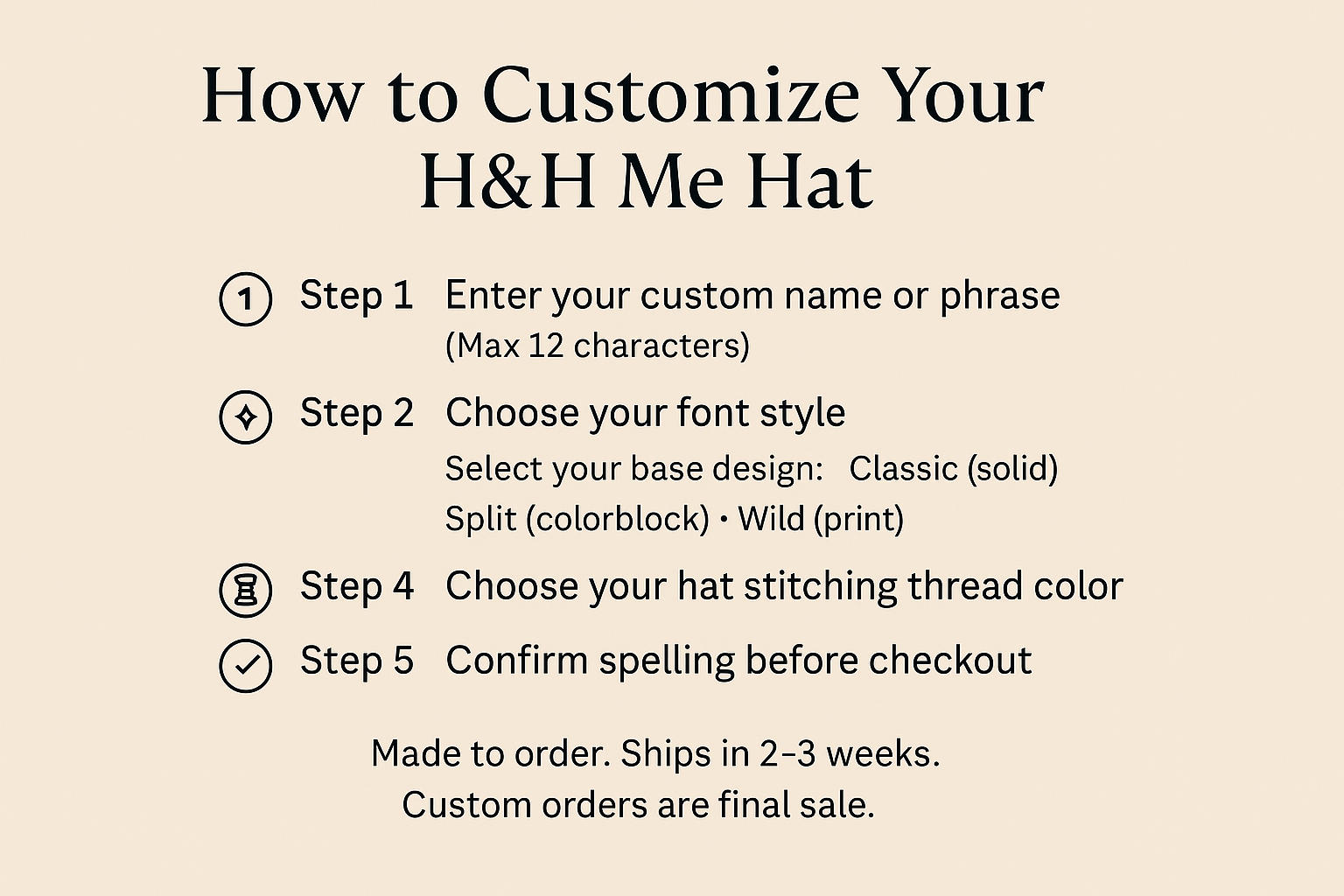 The *H&H Me Split* is your bold, multi-toned take on a personalized cap. Designed with colorblock contrast and stitched with your custom word or name, this fall drop is about showing up as you are.